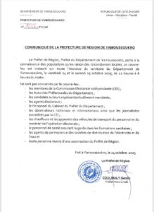 ELECTION PRÉSIDENTIELLE EN CÔTE D’IVOIRE : LE PRÉFET DE YAMOUSSOUKRO DÉCRÈTE UN COUVRE-FEU