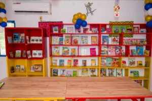 À l’intérieur, les invités et les élèves ont pu découvrir un cadre soigné et fonctionnel : deux grandes armoires de rangement déjà garnies de livres pour enfants, deux grandes tables entourées de bancs destinées aux activités culturelles, une grande natte étalée au sol, le tout agrémenté de ballons décoratifs multicolores. Les élèves ont immédiatement investi les lieux pour leurs premières activités de dessin et des jeux.